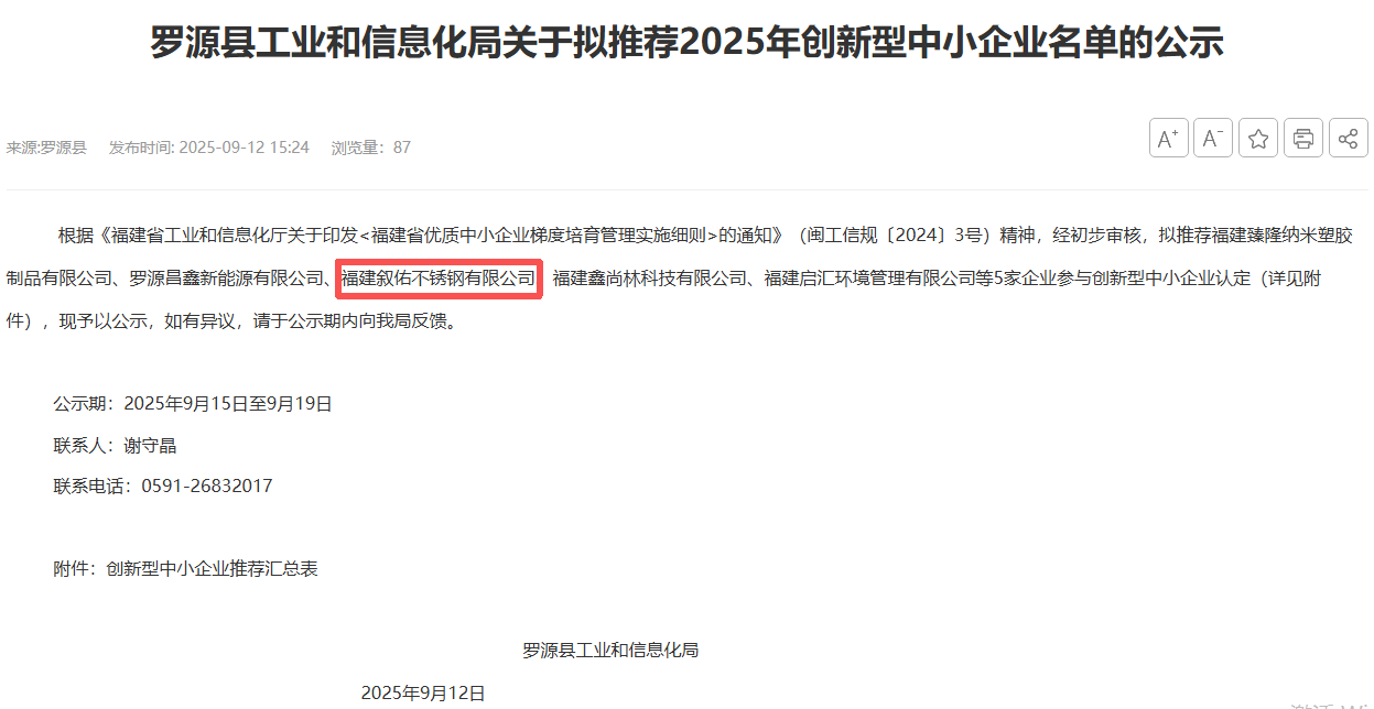 福建叙佑不锈钢有限公司入选罗源县2025年创新型中小企业名单