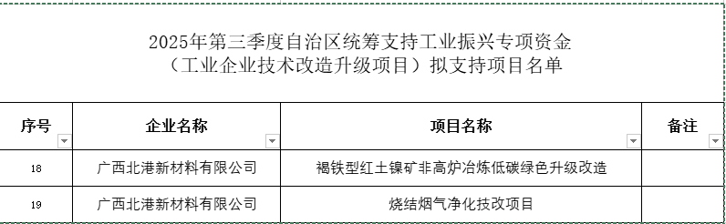 据显示,广西北港新材料有限公司褐铁型红土镍矿非高炉冶炼低碳绿色升级改造、烧结烟气净化技改项目均入选此名单中。